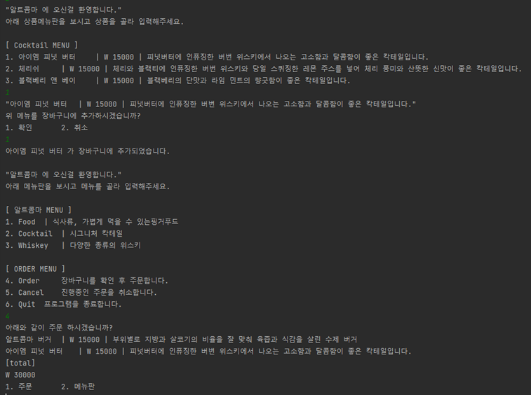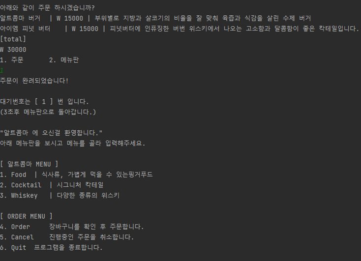 먼저 프로그램을 실행하면 가게의 이름, 메뉴, ORDER MENU 등이 출력된다.