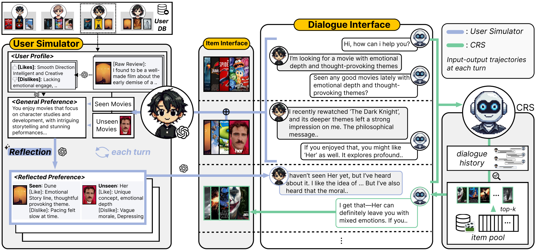 특히, 사용자가 CRS와의 대화를 통해 스스로 선호도를 점차 발견하도록 유도하고, 대화 중 나타나는 아이템들에 대해 일반적인 선호도를 방녕하여 암묵적인 선호도를 대화 맥락에 지속적으로 통합함으로써 사용자 시뮬레이션을 더욱 풍부하게 만듦.