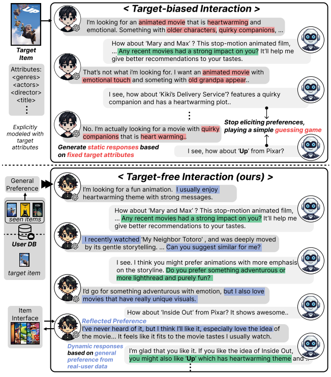 PEPPER는 목표 항목 기반 상호작용의 문제를 해결하기 위해, 실제 사용자 상호작용 이력과 리뷰에서 도출된 다양한 선호도를 기바으로 한 target-free 사용자 시뮬레이터를 도입 함.
