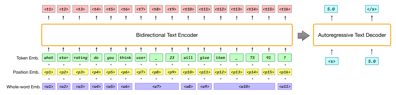 중요 포인트는 bidirectional text encoder에 임베딩 시퀀스를 입력하기 전에 입력 시퀀스에 포함된 개인의 정보를 P5가 인식할 수 있게 sub-word 토큰들이 동일한 원 단어에서 나왔는지 나타내는 whole-word임베딩도 함께 적용함