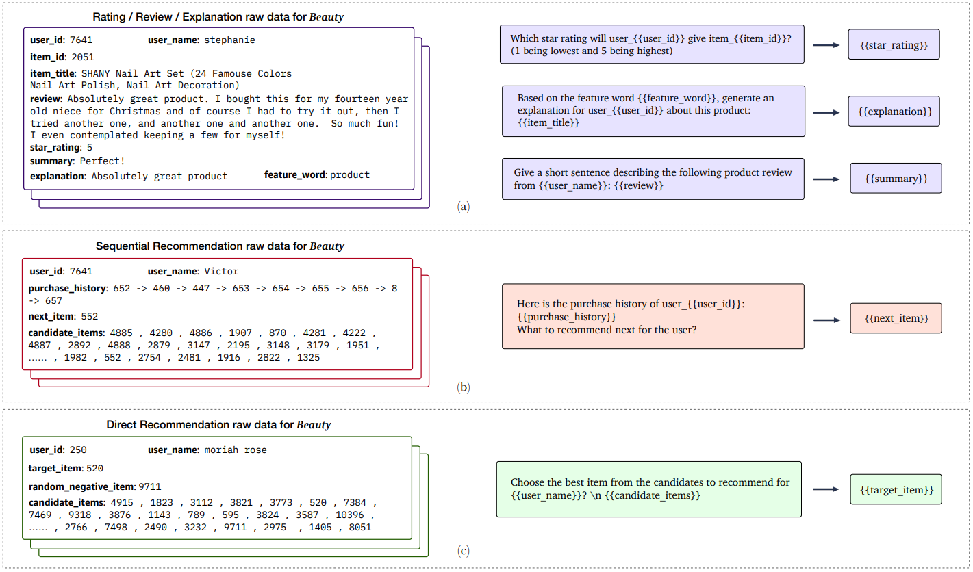 모든 문제는 프롬프트 기반 자연어 처리 task로 표현되며, 사용자 및 아이템 정보는 개인화된 프롬프트 템플릿을 통해 모델 입력에 통합됨