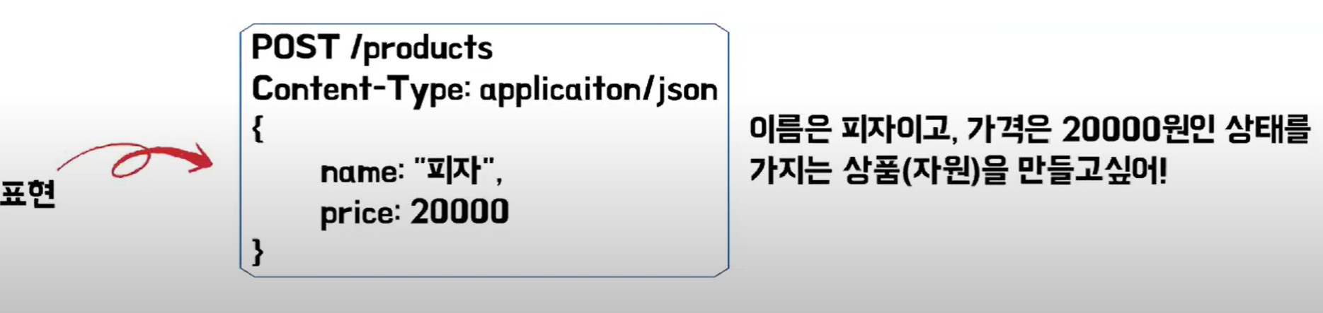 메타데이터 + 데이터이면서 자원의 특정 상태를 의미합니다. 이러한 표현을 통해서 자원을 조작해야 합니다.