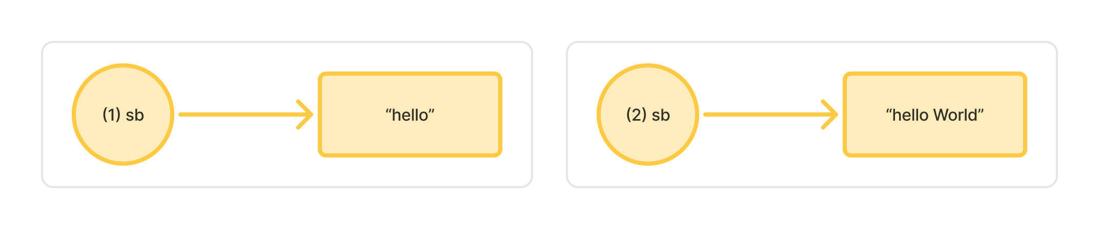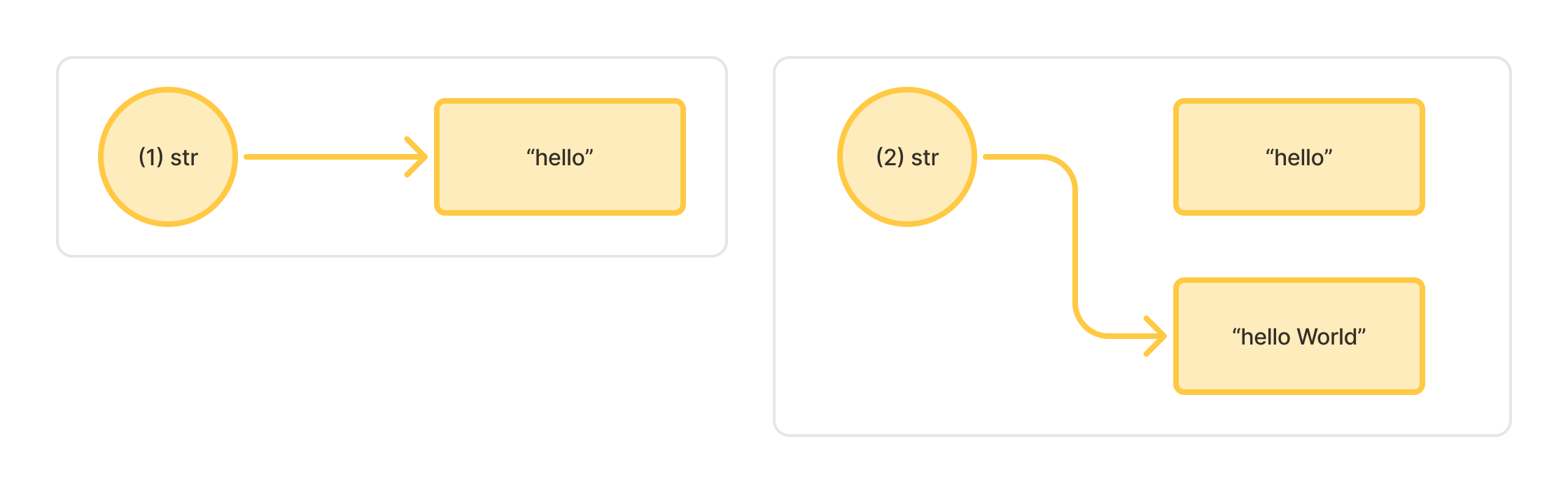str의 뒤에 " World"가 붙여진 것이 아닌 str가 새로운 String("hello World")을 생성하고 할당시킨 메모리 주소를 갖는다.