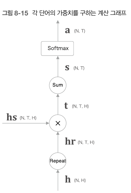 우리는 최종적으로 이 a에 hs를 곱한다음, Affine, Softmax 계층을 거쳐 출력결과를 얻어내야 하게 때문에 이 hs와 a를 곱하는 계층역시도 구현을 해줘야 한다.