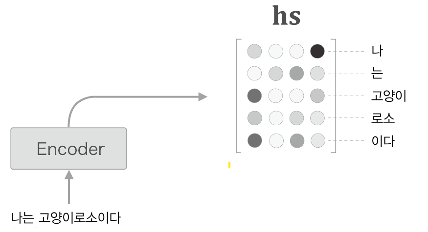 이때 이 hs 행렬에서 각 행은 해당 단어에 대한 벡터정보를 의미할 것이다. 엄밀히 따지면 LSTM 구조의 출력 결과이므로 해당 단어 이전 단어까지의 정보도 포함하고 있을 것이다. 즉 hs의 각행은 각각 나, 나는, 나는 고양이, 나는 고양이 로소, 나는 고양이 로소이다. 라는 정보를 함축하고 있을 것이다.
