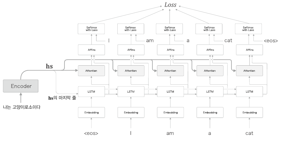 이 정보가 Decoder 파트로 넘어가면 Decoder에서 각각의 출력마다 이 hs를 참조한다. 이때 그냥 참조하는 것이 아니라 각 LSTM의 출력때마다 이 정보를 참조하는 것이다. 이전에는 h1~ht에서 ht만을 참고했다면, Attention구조에서는 h1~ht 모두를 참조하는 것이다. 이를 그림으로 표현하면 다음과 같다.