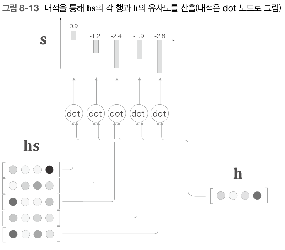 이 그림에서 어떤 계산에 주목해볼 필요가 있다. 어떤 계산이라함은 간단히 말해서 해당 출력결과가 hs의 어떤 행을 가장 중요하게 다뤄야 하는지가 계산되는 것이다. 이 어떤 계산이 바로 Attention 메커니즘이다.