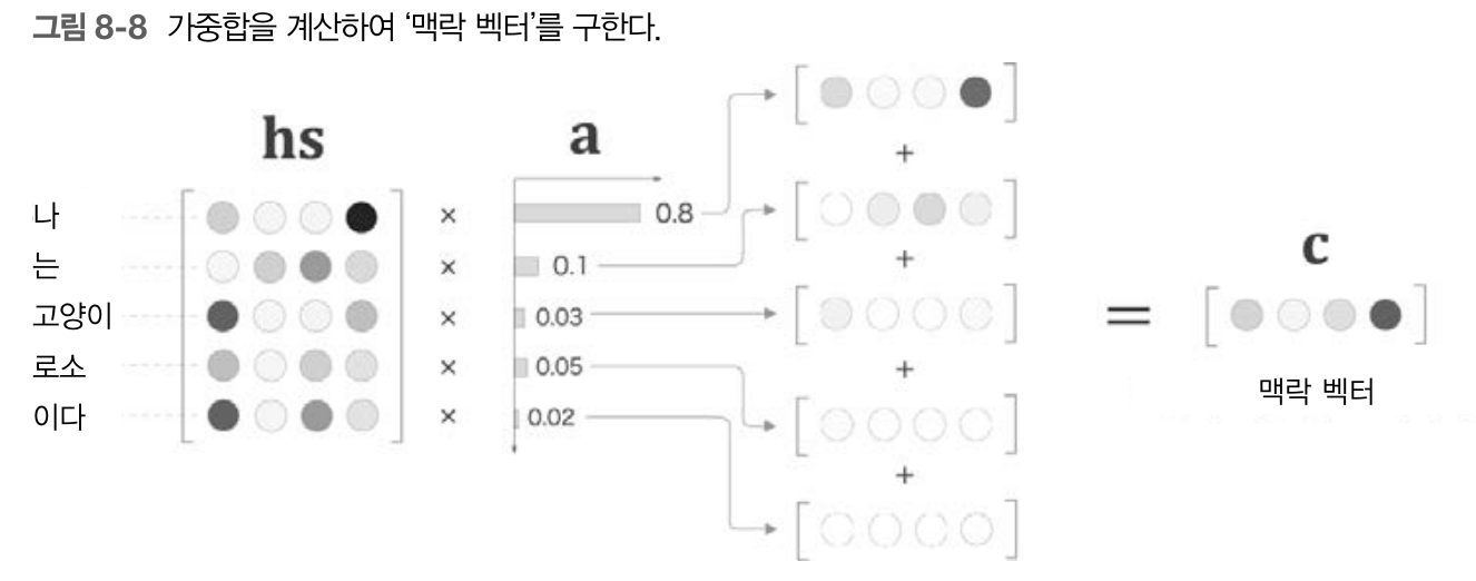 이는 hs에 가중치를 곱함으로써 구해준다. 그냥 곱하고 끝나는 것이아니라 여기에 가중합을 계산해 맥락벡터라는 것을 얻어낸다.