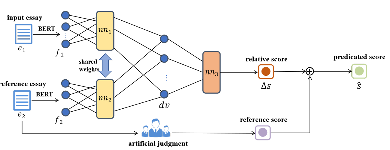 쌍별 랭킹 모델로서, 그림 1에 표시된 세 번째 서브넷 의 출력은 단지 이진(binary) 값입니다. 만약 이 서브넷의 출력 값이 상대 점수에 해당하는 실수 값이 되도록 허용하고 두 번째 입력 에세이를 참조 샘플로 지정한다면, 변환된 모델은 사실상 기본적인 대조 회귀 모델입니다.