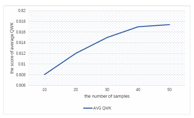 그림 2는 참조 에세이의 수를 다르게 하여 예측한 결과를 보여줍니다. 그림 2의 성능 곡선은 의 수가 증가함에 따라 성능이 점진적으로 향상되다가, 이 40보다 클 때 성능 성장이 수렴하는 경향을 보임을 나타냅니다.