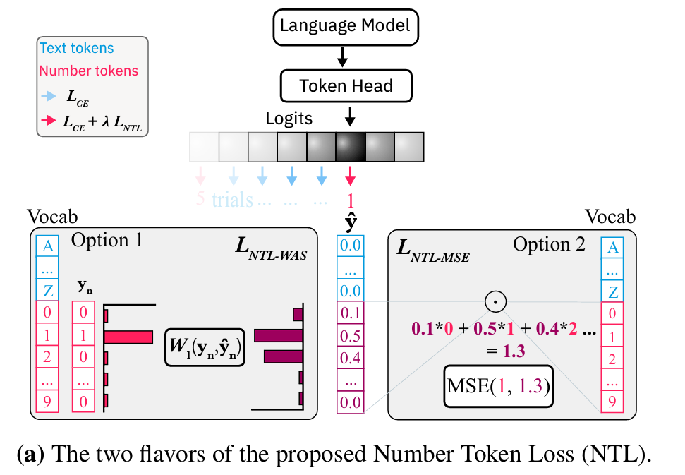 본 논문에서는 수학 문장제 문제나 과학 데이터셋과 같이 텍스트와 수치 데이터가 결합된 자료를 더 잘 다룰 수 있도록, 언어 모델(LM)에 더 나은 귀납적 편향(inductive biases)을 부여하고자 합니다. 저희는 수치적 근접성을 존중하며 표준적인 교차 엔트로피(CE)와 효과적으로 결합될 수 있는, 숫자 토큰에 대한 두 가지 버전의 회귀 손실(regression loss)을 제안합니다 (그림 1a). 숫자 토큰 손실(NTL)의 첫 번째 버전은 정답 레이블의 수치 값과, 예측된 클래스 확률에 각 숫자 토큰 값을 가중치로 부여한 값 사이의 평균 제곱 오차(MSE)를 계산합니다. 두 번째 버전은 예측된 숫자 확률 분포와, 정답 레이블의 원-핫 인코딩(one-hot encoding)인 실제 분포(ground truth distribution) 사이의 바서슈타인(Wasserstein) 거리를 계산합니다.