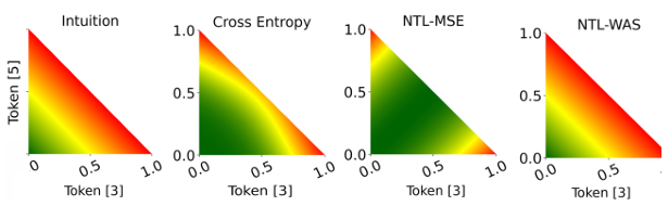 그림 2. 이 히트맵은 실제 정답(ground truth)이 토큰 4일 때, 토큰 3과 5에 대한 클래스 확률의 조합에 따른 각각의 손실 값을 보여줍니다. NTL-WAS의 동작 방식은 손실 함수로서 기대되는 직관적인 형태에 가장 가까운 반면, NTL-MSE는 유일한 최솟값(unique minimum)을 갖지 않습니다.