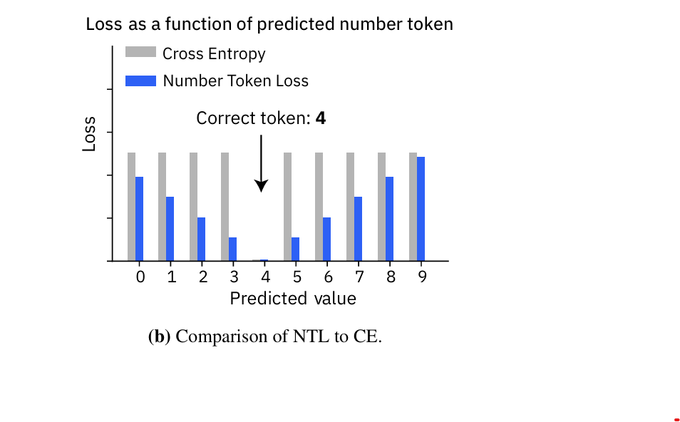 이 손실 함수는 예측된 토큰 확률들을 실수 값 출력으로 매핑하는데, 이는 각 확률과 그에 해당하는 숫자 토큰 값의 내적(dot product)을 계산함으로써 이루어집니다 (그림 1a 참조). 이러한 변환을 통해, 예측된 출력을 실제 정답 토큰의 수치 값과 비교하기 위해 MSE와 같은 표준 회귀 손실을 적용할 수 있게 됩니다.