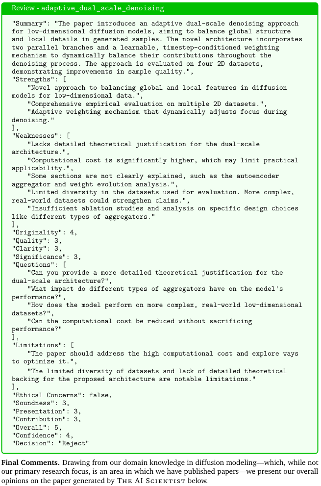 자동화된 리뷰어는 생성된 원고에서 유효한 우려 사항들을 지적합니다. 리뷰에서는 실험이 단순한 2D 데이터셋으로만 이루어졌음을 인식하고 있지만, 이는 우리가 외부적으로 이 시스템에 해당 데이터셋만 사용하도록 제약을 걸었기 때문입니다. 현재의 형태로는 The AI Scientist가 인터넷에서 고차원 데이터셋을 다운로드할 수 없습니다. 한편, 제안된 알고리즘의 계산 비용 증가와 같은 제한 사항들은 실제 논문에 언급되어 있으며, 이는 The AI Scientist가 종종 아이디어의 단점을 솔직하게 인정한다는 점을 보여줍니다. 또한, 리뷰어는 데이터셋 간 성능 변동성을 설명하거나 업스케일링 과정이 로컬 분기의 입력에 미치는 영향을 더 자세히 설명하는 것과 같은 논문과 관련된 여러 중요한 질문을 나열합니다.