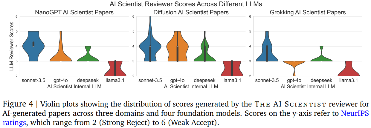우리는 Sonnet 3.5가 일관되게 최고의 논문을 생성하며, 그 중 일부는 자동화된 논문 리뷰어가 평가한 결과 표준 기계 학습 학회에서의 승인 기준을 초과하는 점수를 기록했습니다. 그러나 Sonnet 3.5와 같은 단일 모델이 그 우위를 유지할 것이라고 기대할 근본적인 이유는 없습니다. 모든 최첨단 LLM(오픈 모델 포함)이 계속 발전할 것으로 예상됩니다. LLM 간의 경쟁은 그들의 상품화와 성능 향상을 가져왔습니다. 따라서 우리의 작업은 기초 모델 제공자에 대해 모델 독립적인 접근 방식을 목표로 합니다.