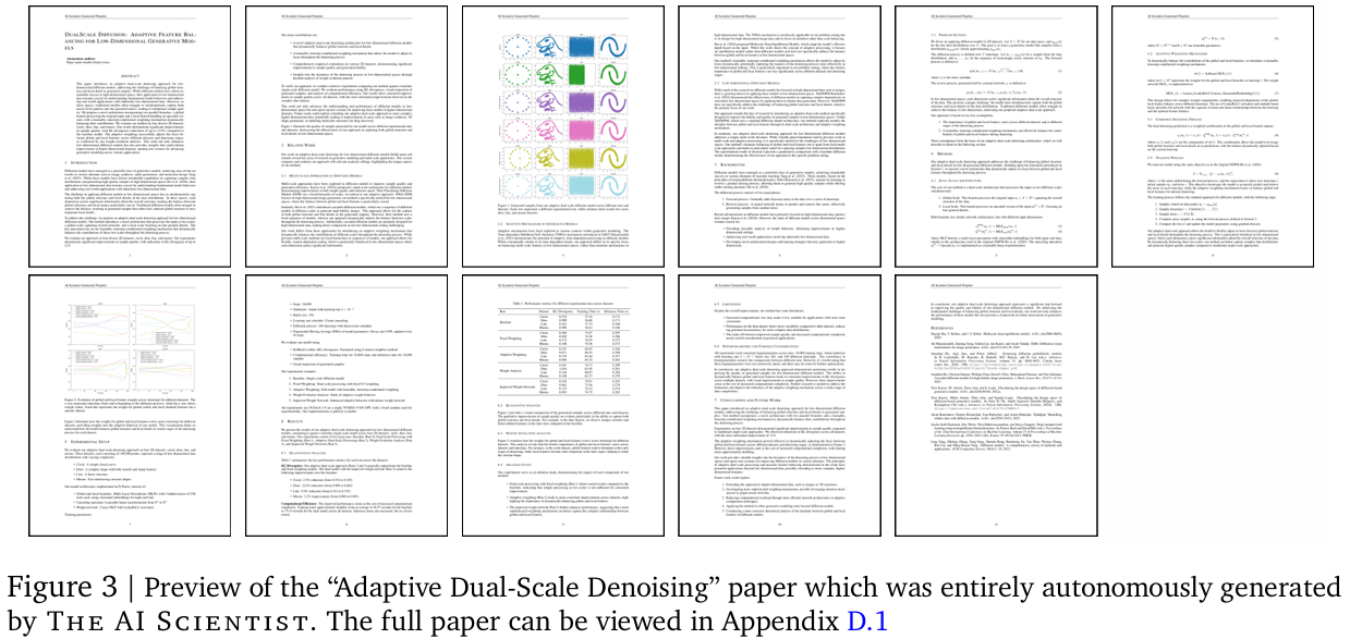 The AI Scientist가 생성한 논문에 대한 광범위한 실험과 메트릭을 6장에서 제시하기에 앞서, 먼저 The AI Scientist의 실행 중 대표적인 샘플을 시각화하여 그 강점과 약점을 보여준 뒤, 그 잠재력에 대해 폭넓게 논의합니다. 선택된 논문인 “Adaptive Dual-Scale Denoising”은 The AI Scientist가 확산 모델링에 대한 연구를 수행하도록 요청받은 실행에서 생성되었습니다. 이에 대한 자세한 내용은 6.1장에서 다룹니다. 사용된 기본 기반 모델은 Claude Sonnet 3.5(Anthropic, 2024)입니다.