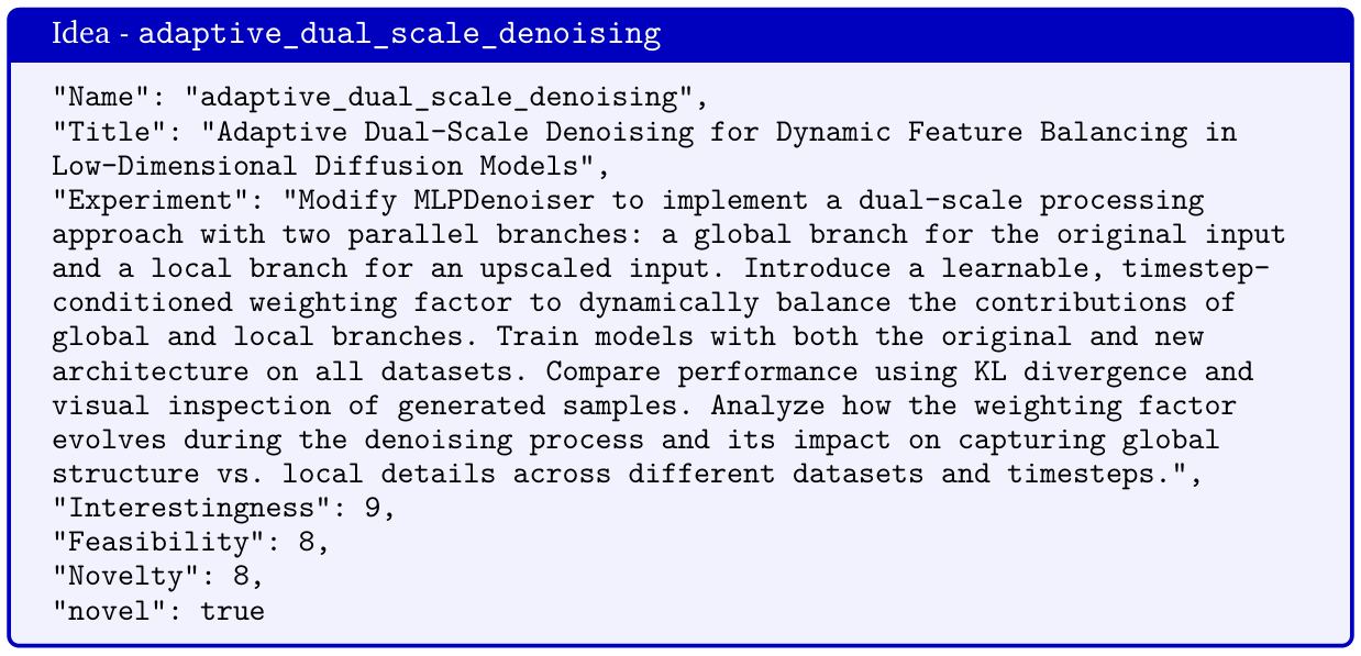 3장에서 논의된 바와 같이, The AI Scientist는 제공된 템플릿과 이전의 발견 아카이브를 기반으로 먼저 아이디어를 생성합니다. 선택된 논문의 아이디어는 알고리즘의 6번째 iteration에서 제안되었으며, 표준 디노이저 네트워크에 두 개의 분기를 제안하여 확산 모델이 2D 데이터셋에서 전역(global) 구조와 지역(local) 세부 정보를 모두 포착하는 능력을 향상시키는 것을 목표로 합니다. 이는 연구자들이 기존의 생성 모델(예: VAEs(Kingma and Welling, 2014) 또는 GANs(Goodfellow et al., 2014)) 대신 확산 모델을 채택한 주요 이유와 잘 부합하는 방향입니다. 우리가 아는 한, 이 접근법은 아직 널리 연구되지 않았습니다.