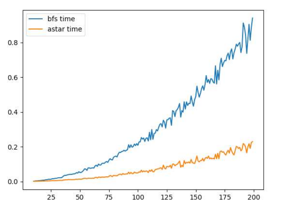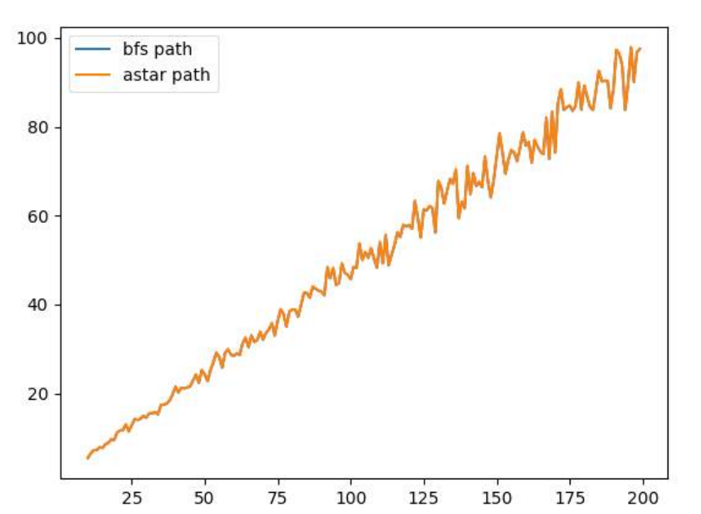 언뜻 보면 하나의 그래프 같지만 실제로는 두개의 그래프가 겹쳐서 나머지 하나의 그래프가 거의 보이지 않는 것이다. 이처럼, input size가 증가함에도 불구하고, A* 알고리즘과 BFS 알고리즘이 return한 경로의 길이는 거의 똑같다는 것을 알 수 있다. 즉 input size와 상관없이 A* 알고리즘은 매우 높은 정답률을 보여준다.