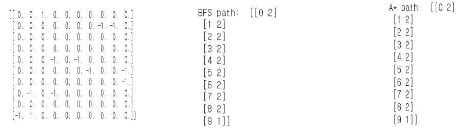 이렇게 PathPlanning을 만든후, 다음과같이 class를 생성하고 Map과 bfs,astar 함수를 호출하면 다음과 같은 결과를 얻는다.