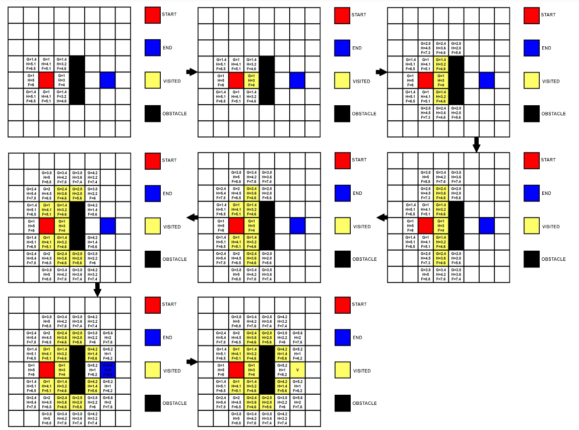 하지만 A* 알고리즘은 여기에 시간적인 측면에서 조금 더 개선된 방식이다. BFS 알고리즘이 해당 지점과 인접한 지점들을 모두 방문하는 반면, A*알고리즘은 인접한 지점들 중 가장 빨리 목적지 까지 도달할 가능성이 높은 지점만 방문하는 것이다. 예를 들어 현재 위치가 a라고 할 때 a와 인접한 지점이 (b,c,d,e)가 있다고 가정해보자. bfs의 경우 (b,c,d,e)로 모두 이동해 해당 지점과 인접한 지점들을 또 탐색한다. 하지만 A*알고리즘의 경우는 (b,c,d,e)중 가장 목적지까지 빨리 도달할 것 같은 지점을 먼저 이동한다. 이때 각 지점 (b,c,d,e)에는 수치 정보가 주어지고, 이 수치를 바탕으로 이동할 장소를 결정한다. 이 수치정보는 평가함수 F이고 F = G + H를 의미한다. G는 시작지점으로 부터 해당 지점까지 실제로 이동하게 될 거리이고, H는 휴리스틱 함수이며 해당 지점으로 부터 목적지까지 얼마만큼 이동해야 할지 예측한 거리이다. A* 알고리즘은, 이 H를 해당지점으로부터 목적지까지 장애물을 고려하지 않은 직선거리로 계산한다. 최종적으로 탐색한 지역 중 F값이 가장 작은 지점부터 먼저 방문을 진행한다.