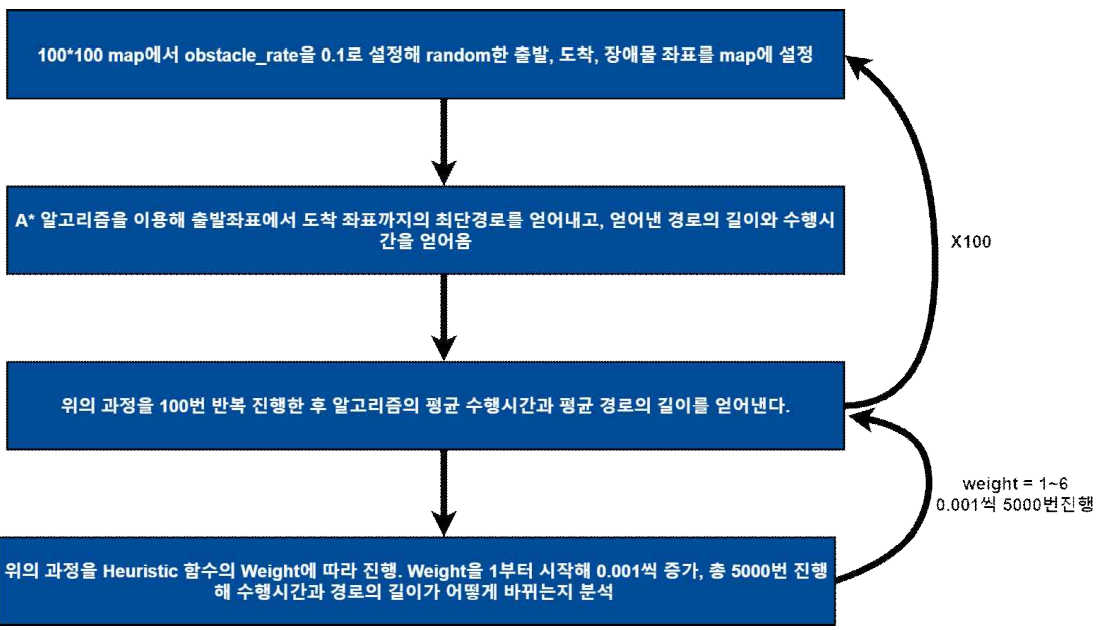 추가로 A* 알고리즘의 성능을 개선해 보고자한다. F = G + H에서 이 휴리스틱 함수 H에 가중치를 곱해 Weighted A* 알고리즘을 구현할 수 있다. 즉 F = G + H가 아닌 F = G + W*H를 사용해서 목적지로의 지향성을 더욱 높일 수 있다. 이 W를 조금씩 여러 번 증가시킬 때 알고리즘의 성능이 어떻게 변하는지도 분석해 보고 최적 가중치를 얻어내 A* 알고리즘의 성능을 개선해보고자 한다