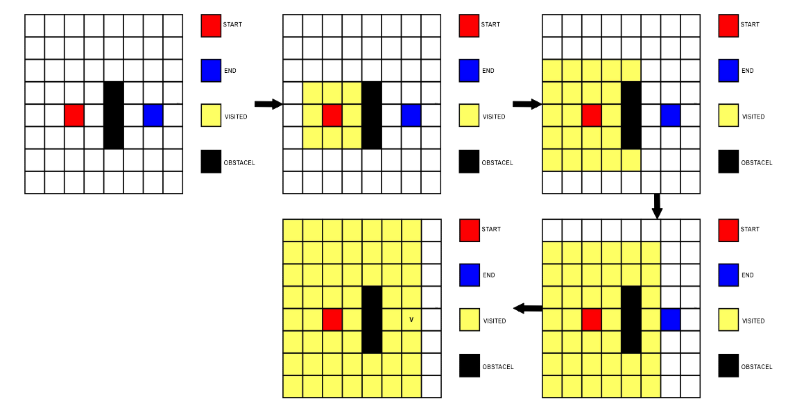 BFS 알고리즘은 전수조사 기법을 사용한다. 먼저 시작 지점과 인접한 지점들을 모두 방문하고, 또 인접한 노드들로부터 인접한 노드들을 모두 방문하고 이런 과정을 모두 거쳐 목적지까지의 최단 거리와 경로를 알아낸다.