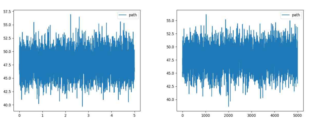 경로의 길이는 딱히 증가하는 추세를 보이지 않는 것으로 보아 가중치가 1~6인 구간 내에서는 정답률에 큰 영향을 끼치지 않는 것으로 보인다. 혹시 가중치의 구간이 너무 작은 것이 아닌가 싶어 가중치를 1~5000으로 설정하고 똑같이 그래프를 그려보니 그래프는 오른쪽 그림과 같이 큰 변화가 없는 것으로 보였다.