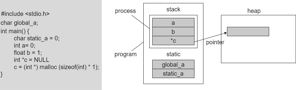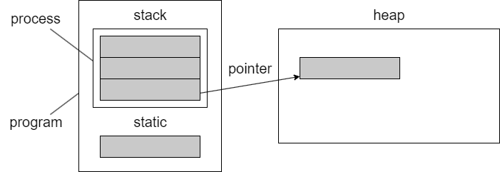 이 그림은 본인이 그냥 그리라고 하면 그릴 수 있을 정도로 기억을 해놓으세요. 요즘 세상에 프로세스 하나인 프로그램은 거의 없습니다. 멀티 프로세스죠 근데 그래서 메모리도 프로세스 각각 가지고 있는 메모리가 있고요. 그 여러개의 프로세스들이 공유하는 메모리가 있어요 여기 공유하는 메모리 공간을 static이라고 합니다. 그리고 프로세스 specitic한 메모리 공간을 stack이라고 해요. 그래서 지금 두개 나왔습니다. stack, static. 그리고 프로그램 외부에 운영체제가 관리하는 커다란 메모리가 있어요. 이게 heap이에요. 그래서 여기 슬라이드를 보면 이제 코드를 가지고 변수 하나 둘 추가하면서 어디에 저장이 되는 지를 그려놨으니까 한번씩 보시고요.