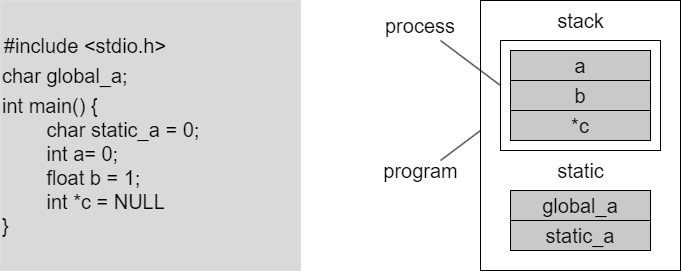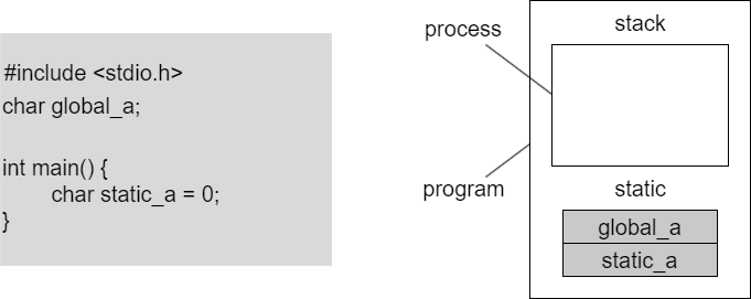 stack의 역할은 내부 함수 안에 있는 이 프로세스가 정의하고 있는 함수안에서 선언된 변수들은 stack으로 갑니다. 예를들어서 메인 함수 안에서 int a;를 했다. 이런거죠. 그리고 static은 두가지가 있을 수 있는데, 내가 이름에다가 static이나 global을 붙여 주면 static으로 갑니다. 차이는 stack은 주소가 continious하게 늘어나고요, static은 그런거 없어요 그냥 어디든 생길 수 있어요. 근데 큰 차이점은 static 변수들은 다른 프로세스들이 다 볼 수 있어요. 프로세스2가 하나 더 있으면 이 프로세스도 볼 수 있습니다. 근데 프로세스가 가지고 있는 각자의 stack은 보지 못합니다. 이게 큰 차이 입니다.