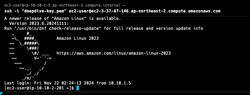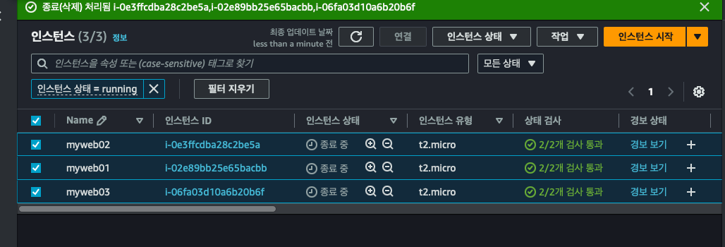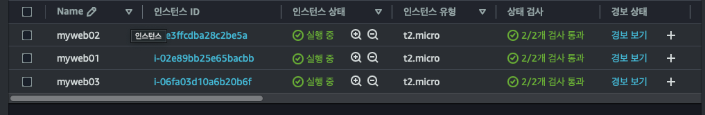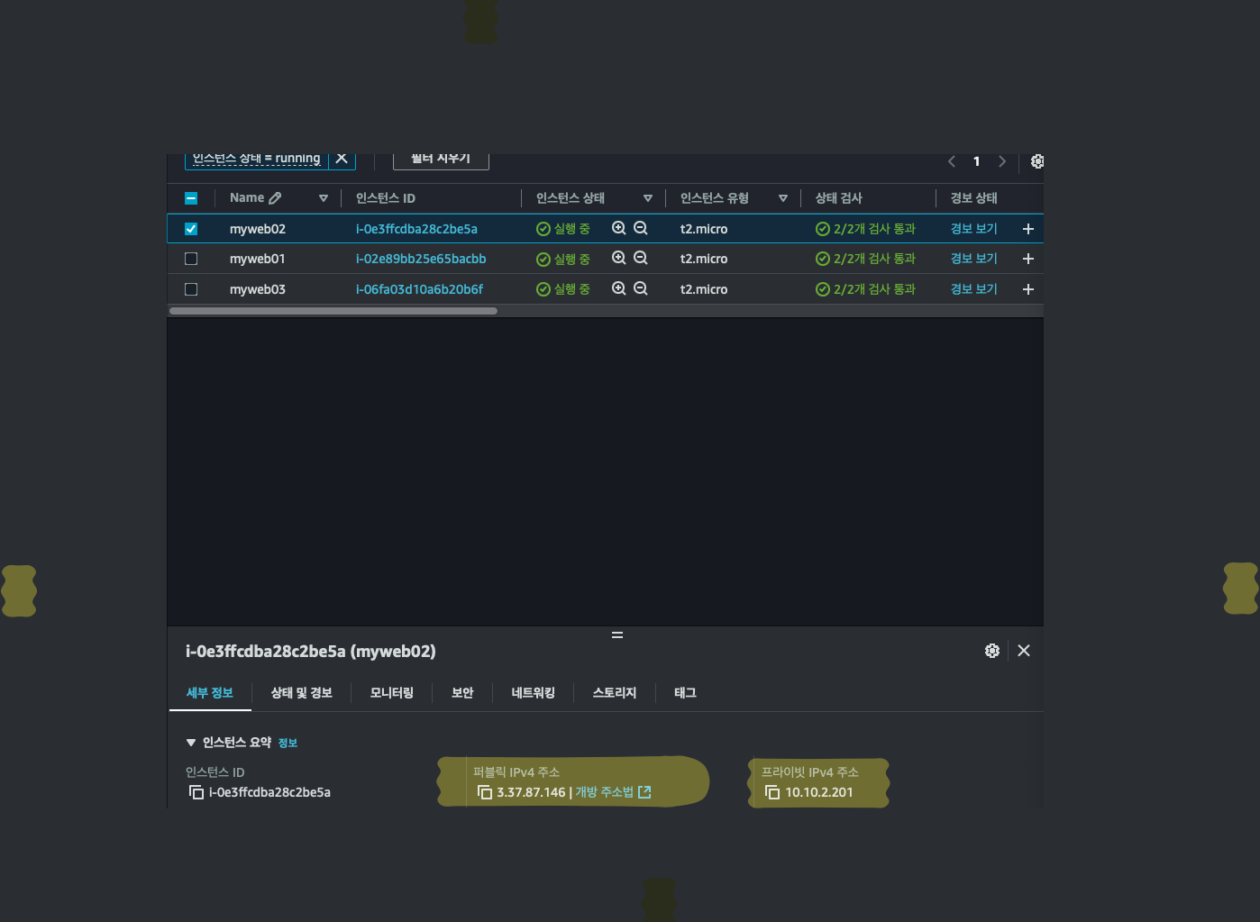 myweb01 인스턴스에서 myweb02 인스턴스로 접속도 잘됨 (접속 하기 위해서는 myweb01에 keypair 가 있어야 함 따라서 로컬에서 myweb01로 키 옮겨줘야지 접속할수 있겠죠?)