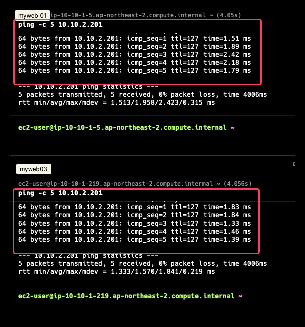 위에 터미널 : myweb01 에서 myweb02 핑 테스트