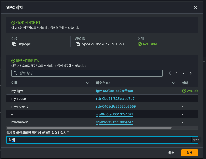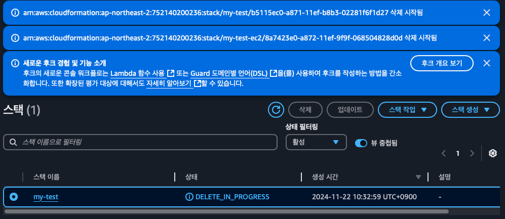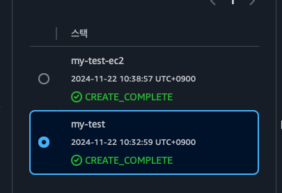my-test 는 vpc 생성 스택이고 my-test-ec2는 ec2 생성이다.