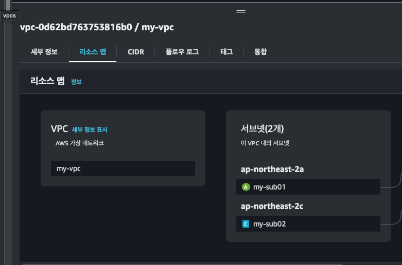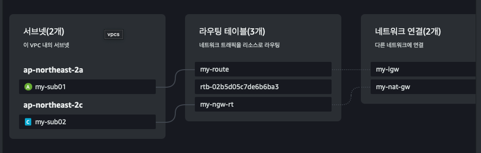 나는 이미 실습을 완료한 상태라 분리가 되있다 하지만 처음 하면 mysub01 과 mysub02가 라우트에 연결 되있는것 이다.