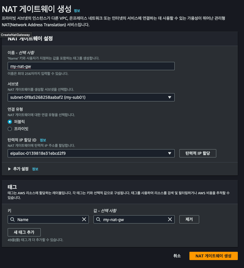 서브넷은 mysub01 에 해야하는 이유는 퍼블릭 서브넷에 있어야 외부와 통신을 시켜줄수 있으니까 퍼블릭 서브넷인 mysub01에 해야함