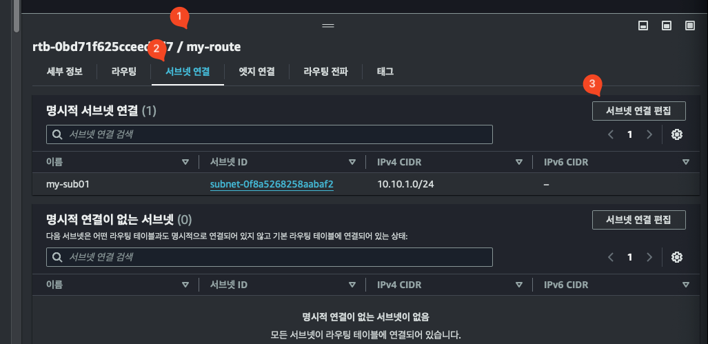 vpc -> 라우팅 테이블 -> 서브넷 연결 -> 서브넷 연결 편집 -> mysub02 연결 해제