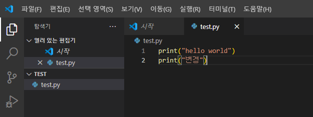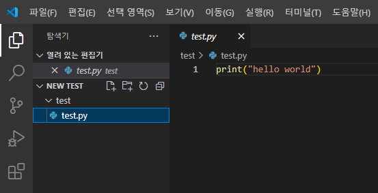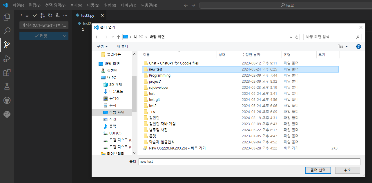 클론해올 폴더를 선택해서 비쥬얼 스튜디오 코드에서 열어줍니다. 저는 new test로 하겠습니다.