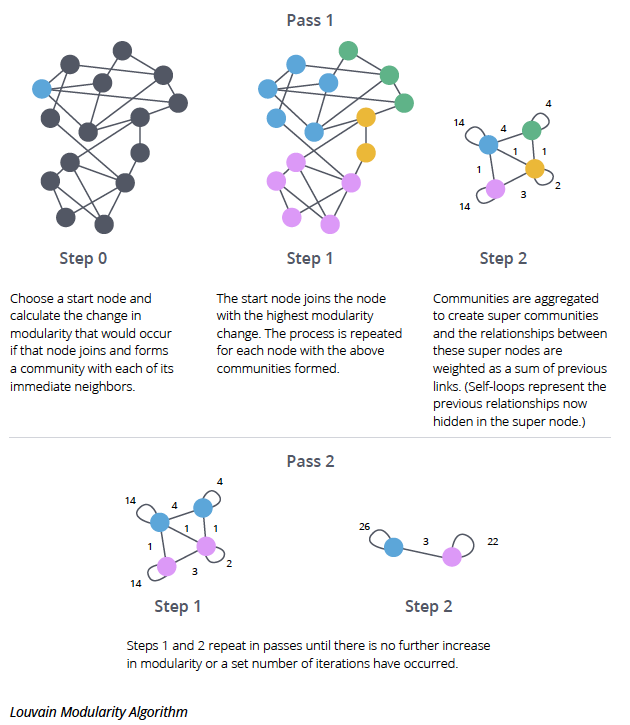 Louvain algorithm은 다음과 같은 과정을 통해 그래프를 분할합니다.