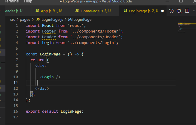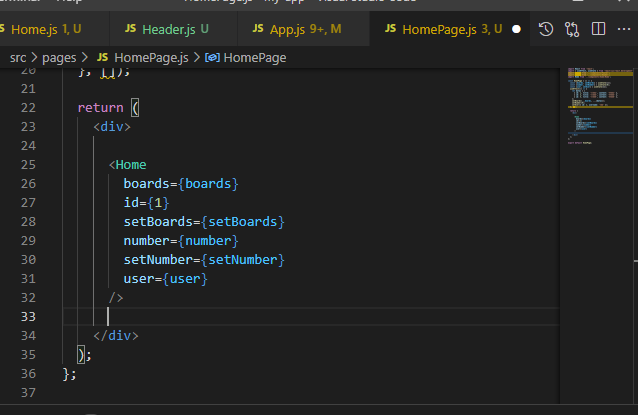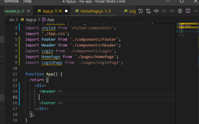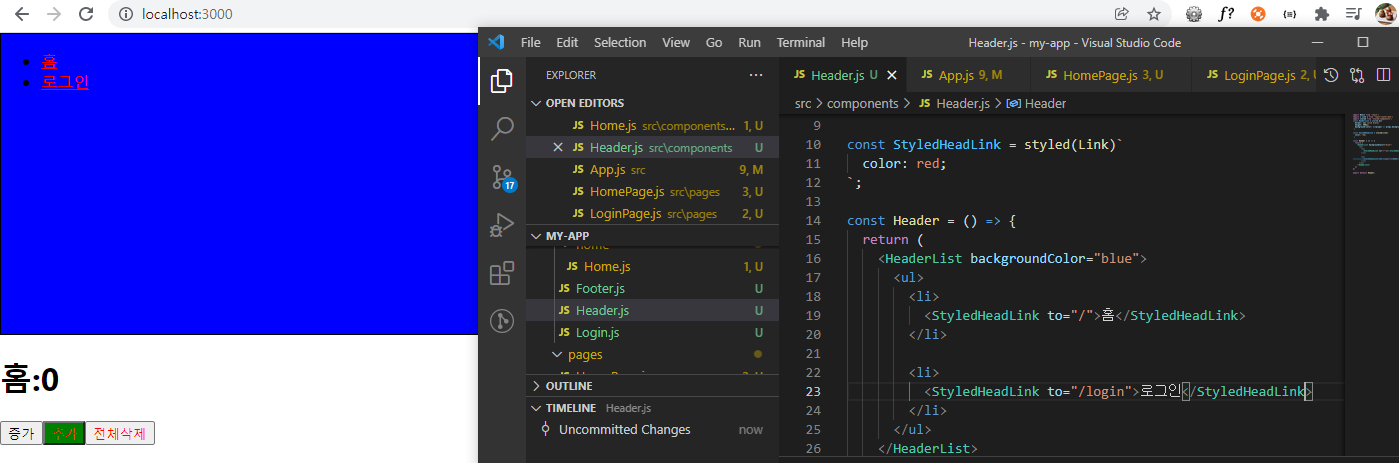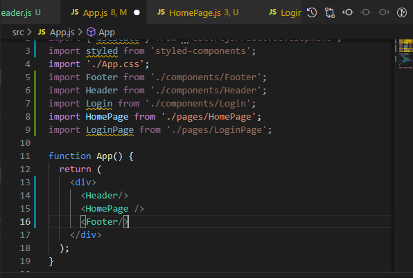 기존에 만들었던 HomePage.js에서 헤더와 푸터를 지웠다.