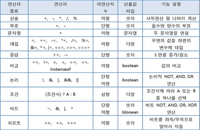 수학적인 계산 처리를 수행하는 문자 또는 기호라고 할 수 있다. 자바에서 연산자는 크게 단항/이항/삼항/대입 연산자로 분류할 수 있고, 이항 연산자에서는 산술, 비트, 비교, 논리, 관계 연산자로 나누어 볼 수 있다.