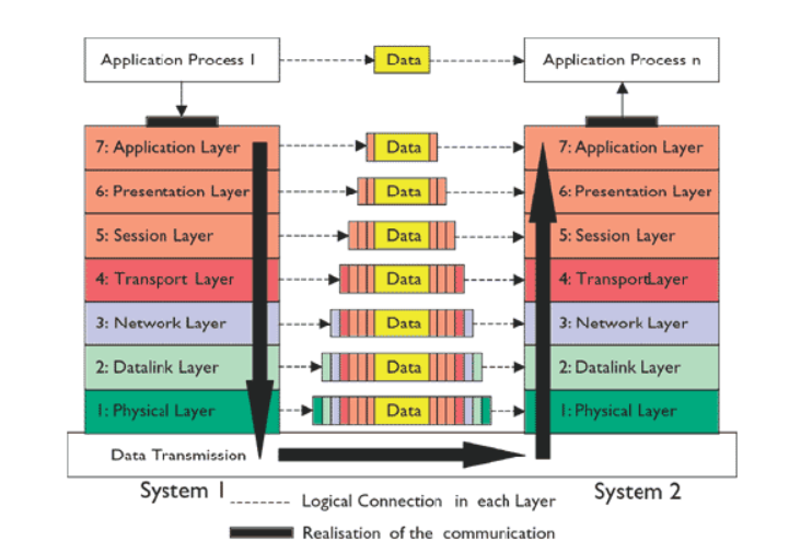데이터를 전송하는 과정에서는 각 OSI 계층이 데이터에 헤더를 추가하거나(또는 데이터 링크 계층에서는 트레일러를 추가) 데이터를 캡슐화(encapsulation)한다. 이렇게 함으로써 각 계층은 다음 계층의 데이터에 자신의 정보를 덧붙여 네트워크를 통해 전송할 준비가 되는 것.