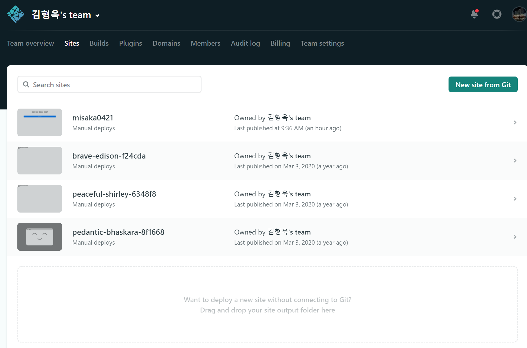 해당 선택한 url의 주제에 Deploys를 클릭하면 위와 같은 화면이 나타나는데 마찬가지로 드래그를 하여 수정한 파일을 업로드 진행을 한다. (위의 3번의 수정이 진행된 결과이다. )
