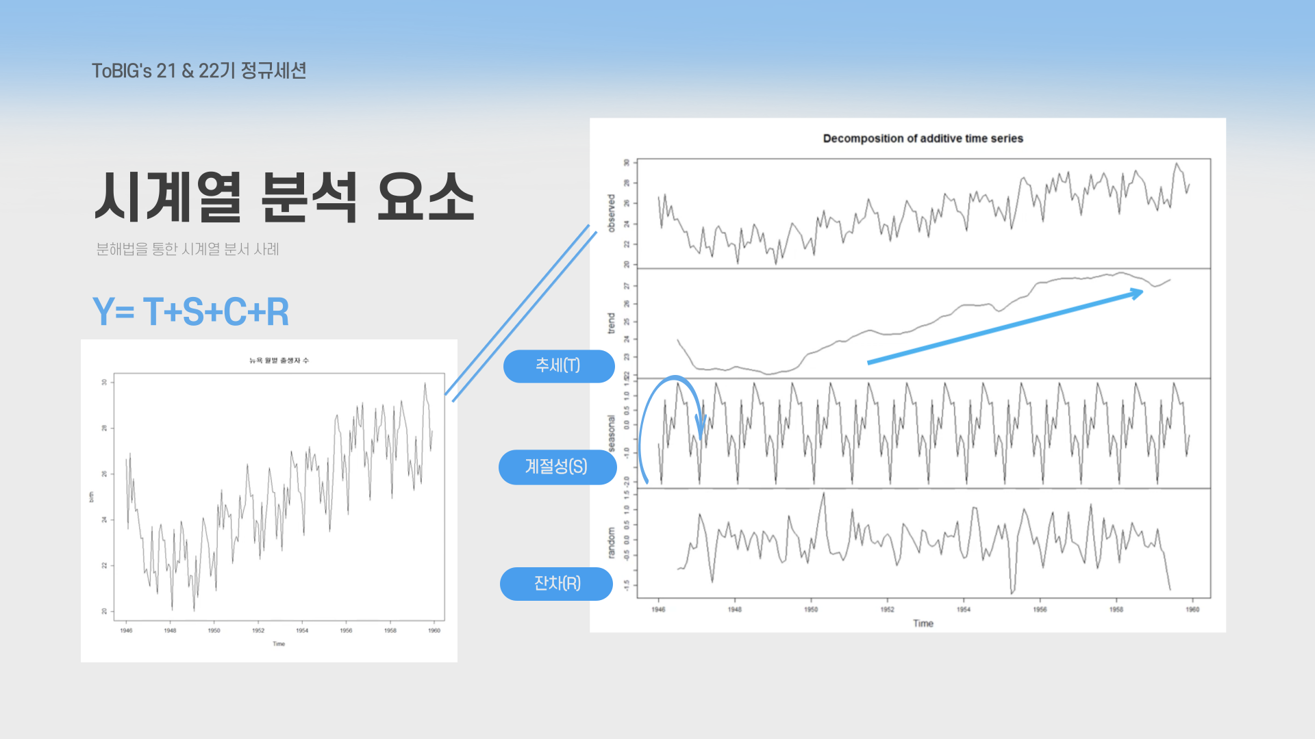 🧩 시계열 데이터 분해식: Y = T + S + C + R
