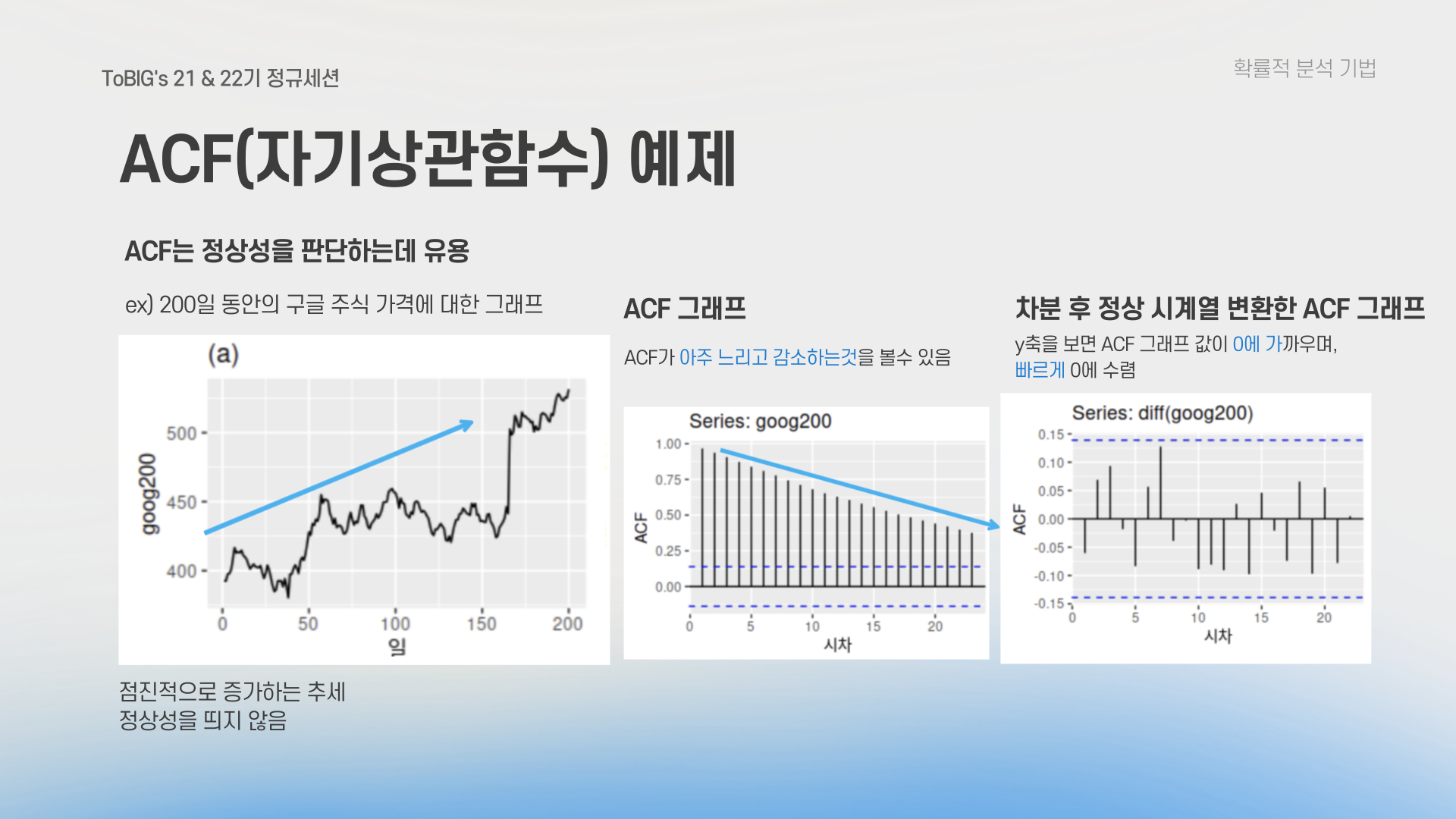 | 비정상성 (Non-stationarity) | 시간에 따라 평균이나 분산이 변함 | 차분(Differencing)이나 변환(Transformation)으로 안정화 필요 |