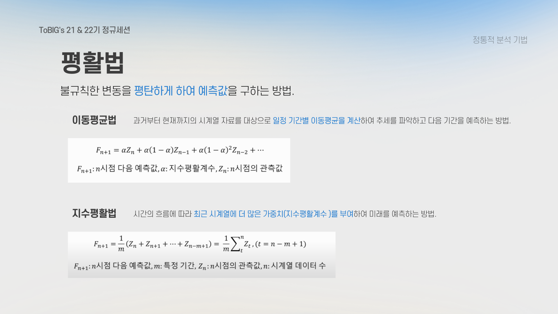 - 평활법: 데이터의 잡음을 제거하고, 추세와 계절성을 쉽게 파악하기 위해 데이터를 평활화하는 방법입니다.