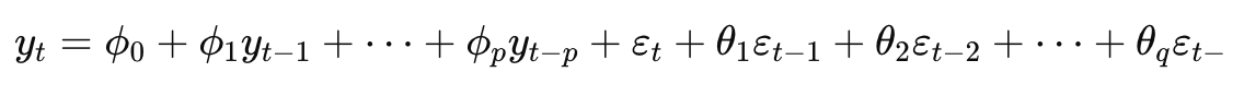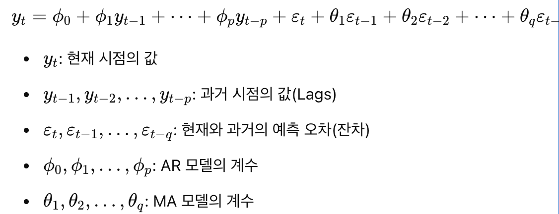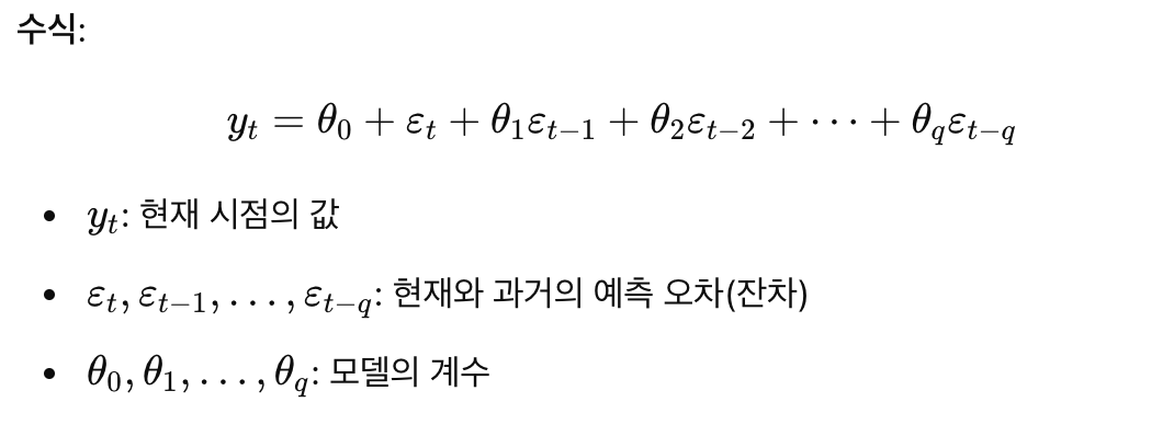 - 이동평균 모델(MA): 잔차의 선형 결합을 통해 미래 값을 예측합니다.
