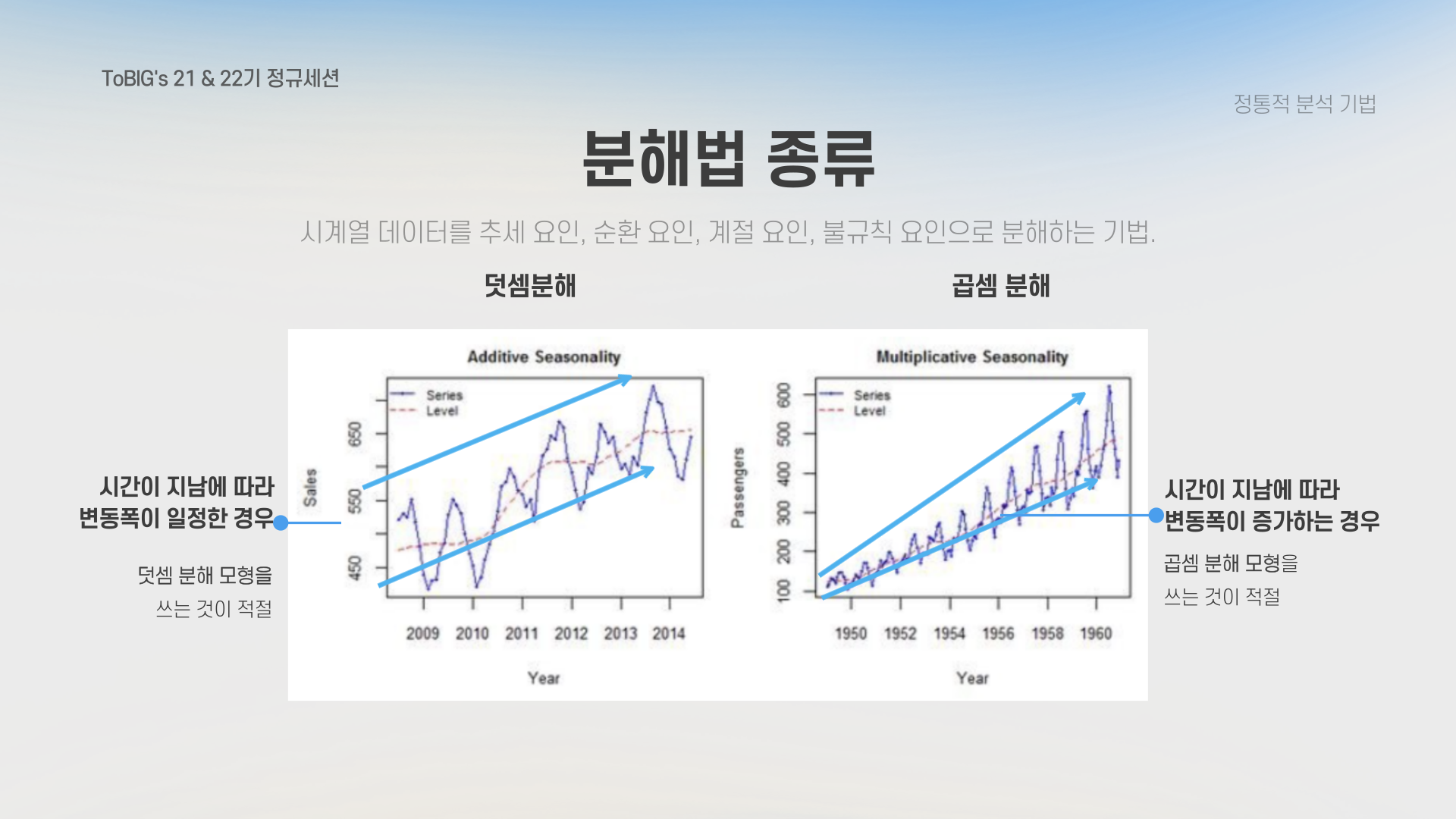 분해법은 시계열 데이터의 주요 구성 요소를 분리하여 분석하고, 각 요소의 패턴을 명확히 파악함으로써 데이터를 더 잘 이해하고, 예측 정확도를 높이는 데 도움을 줍니다.
