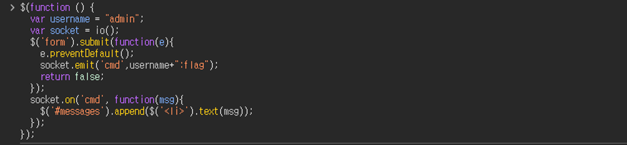 요로코롬 위에는 기존 guest로 설정된 socket의 response가, 아래에는 새로 username을 admin으로 설정한 socket의 response로 FLAG가 나온다.