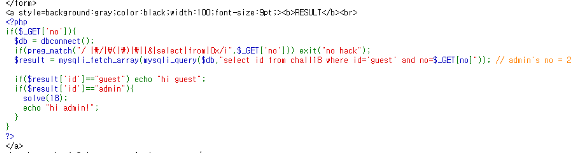 mysqli_fetch_array(mysqli_query($db,"select id from chall18 where id='guest' and no=$_GET[no]")) 를 admin으로 만드려면 admin no = 2라고 했으니까 no를 2로 만들어 주면 된다.
