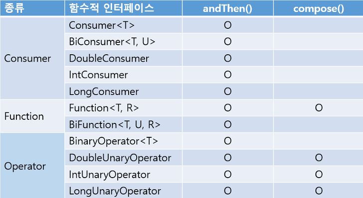 Consumer, Function, Operator 종류의 함수적 인터페이스는 andThen()과 compose() 디폴트 메소드를 가지고 있습니다.