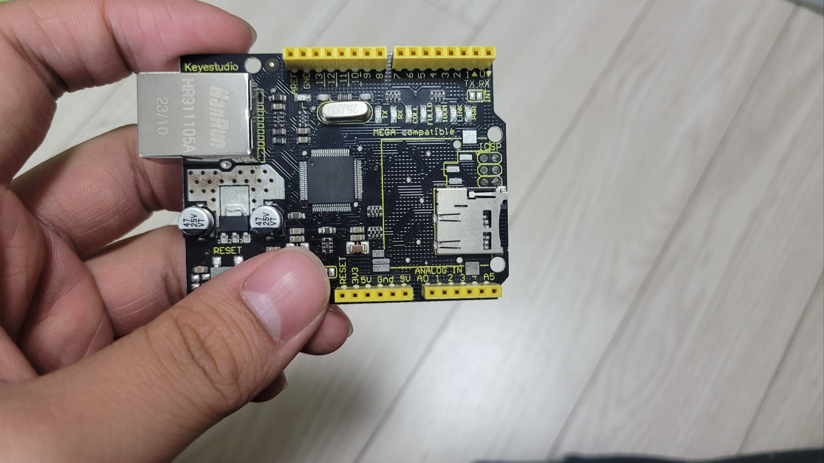 이더넷 쉴드 호환보드는 아두이노 우노 등에 장착해서 이더넷에 접속하여 이더넷 통신을 할 수 있도록 해준다.